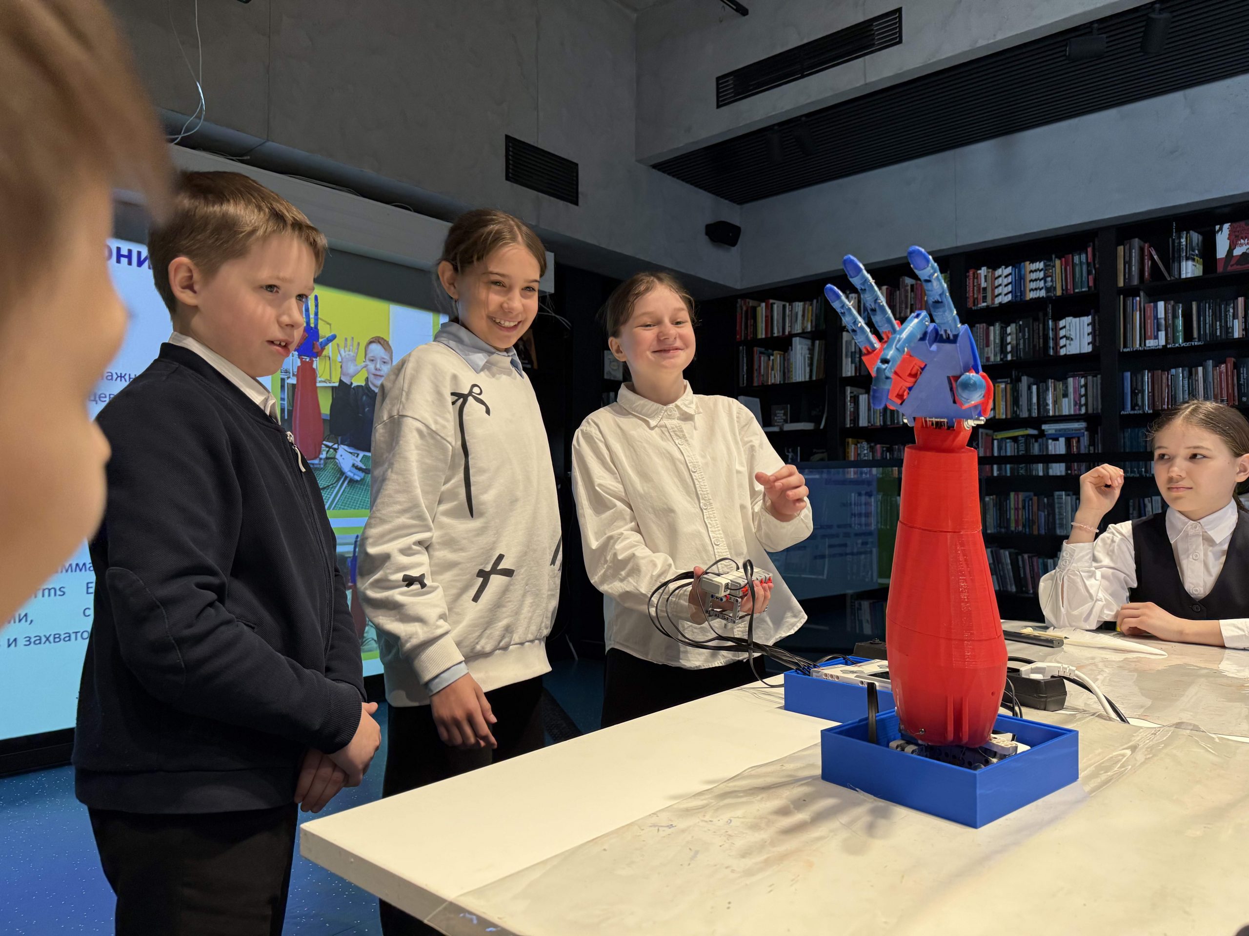 На практической части лекции школьники собрали из картона модель роботизированной руки, повторяющей движения кисти человека. Это простое, но наглядное конструкторское задание можно легко воспроизвести дома из подручных материалов.
