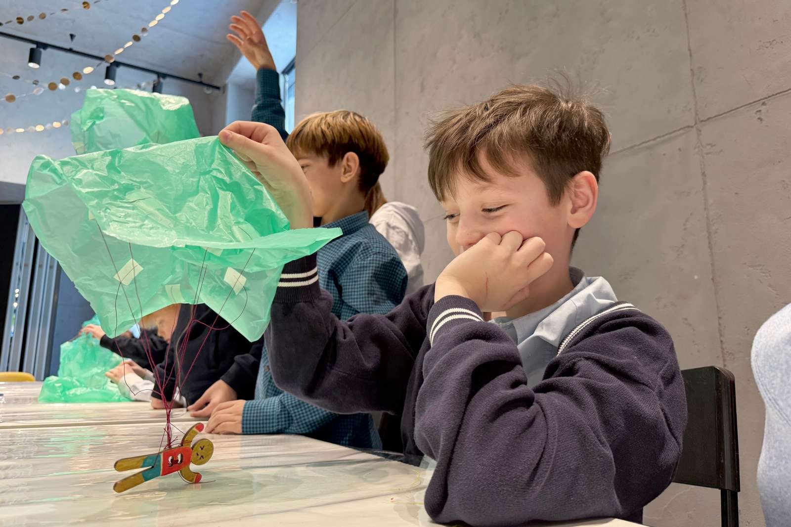 На мастер-классе ребята создали и протестировали собственный парашют. Раскрасили парашютиста из фанеры, поэкспериментировали с формой купола из полиэтиленового пакета, прикрепили стропы и зафиксировали фигурку.