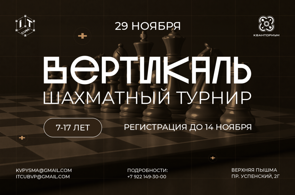 30 ноября в 10:00 на площадке Дворца технического творчества в Верхней Пышме состоится турнир по шахматам «Вертикаль».