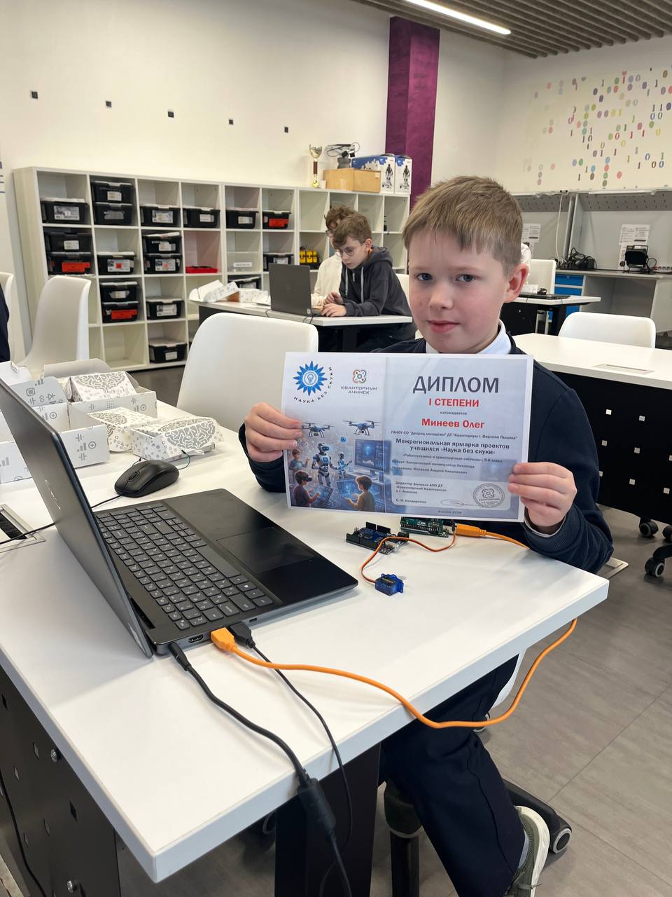 Этой зимой детский технопарк «Кванториум» в Ачинске Красноярского края проводил Межрегиональную ярмарку научных проектов «Наука без скуки». В номинации «Робототехника и транспортные технологии» победил наш кванторианец Олег Минеев.